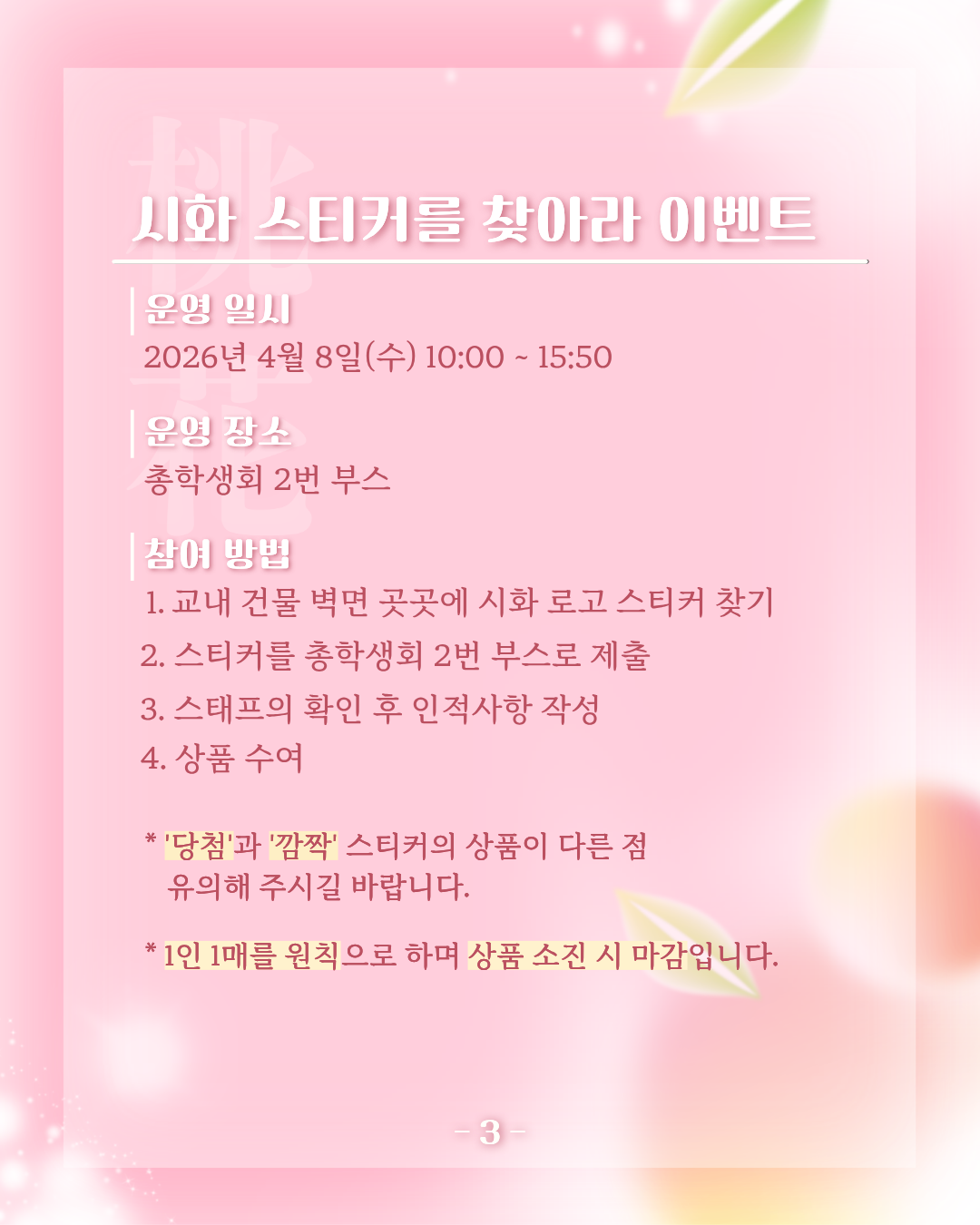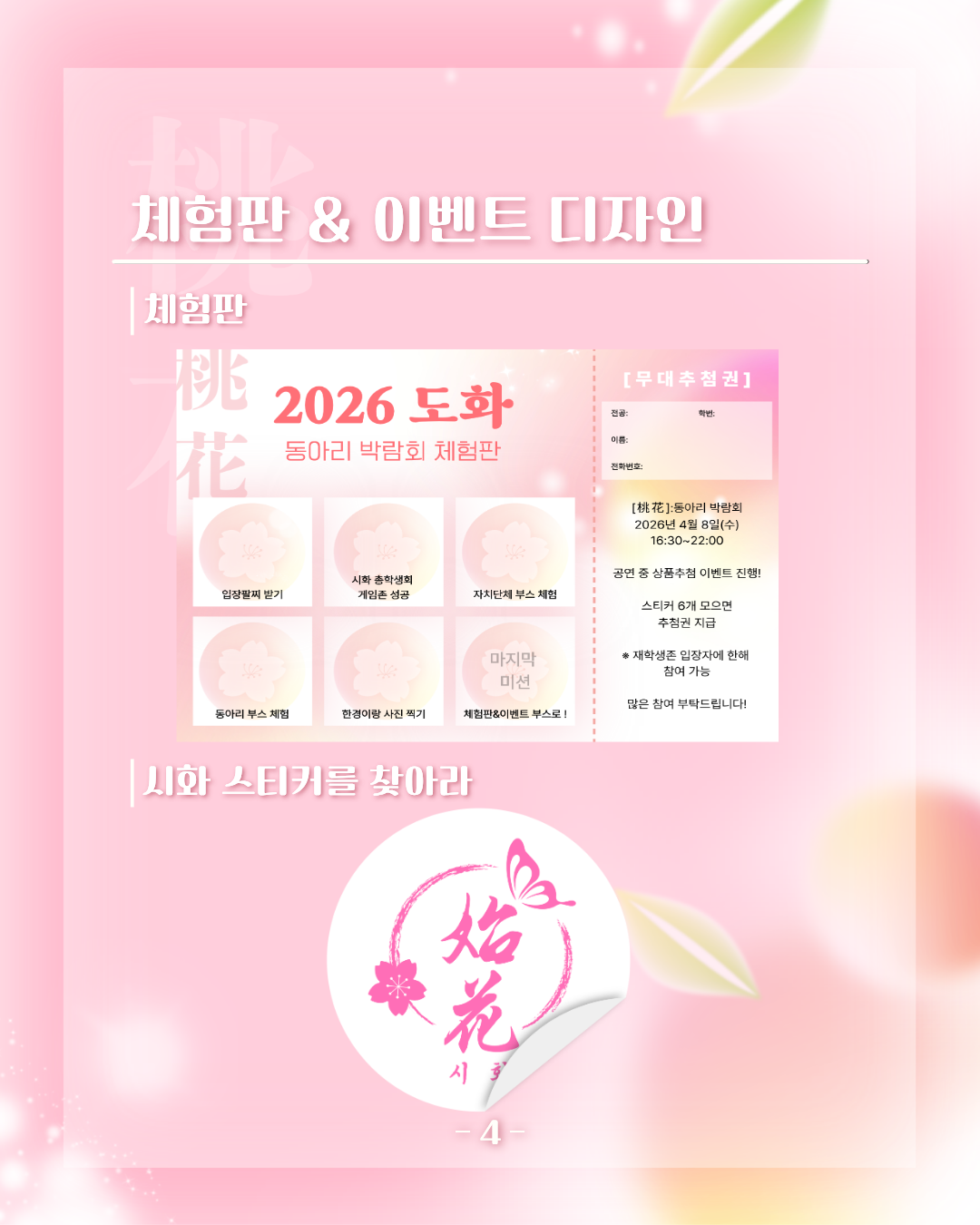 4월 8일 수요일에 진행되는 桃花[도화] 동아리 박람회 총학생회 이벤트 부스 운영 안내드립니다!
