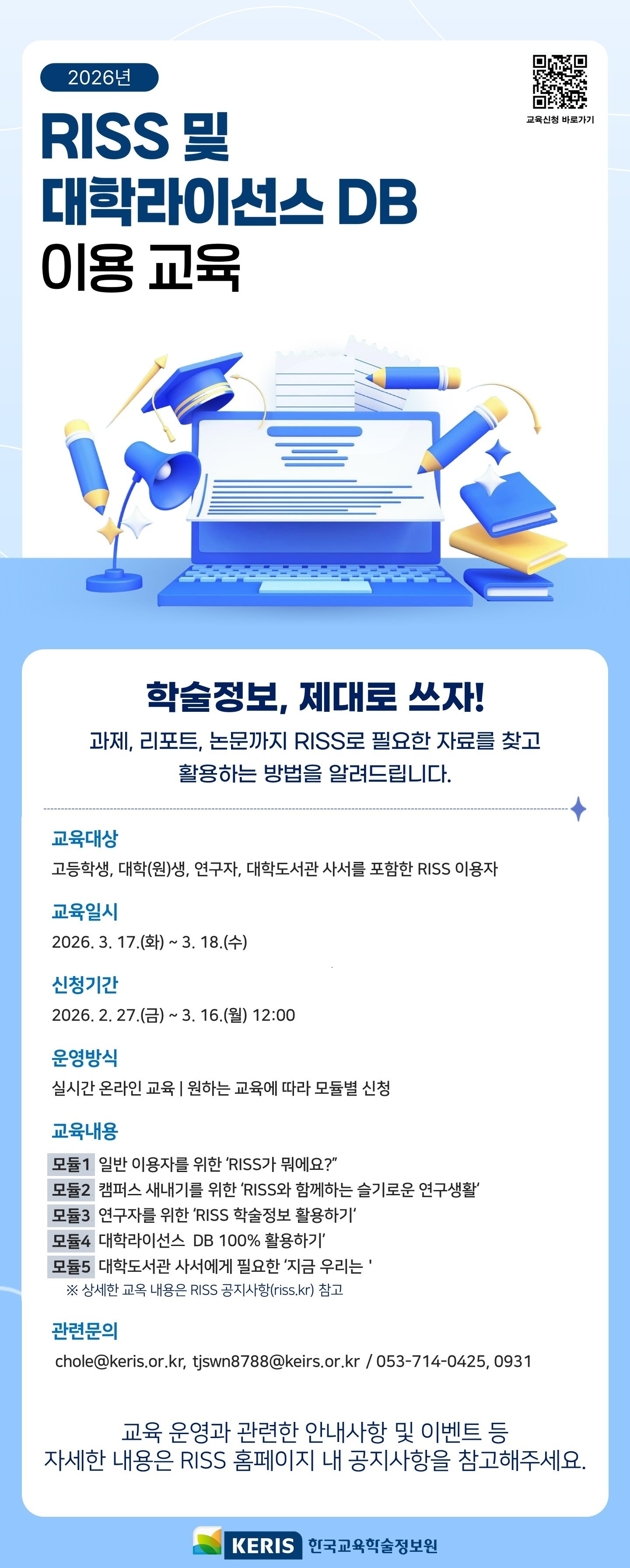 한국교육학술정보원에서 RISS와 대학라이선스 DB 이용교육을 진행하오니 기한 내 교육을 이수하시기 바랍니다.
