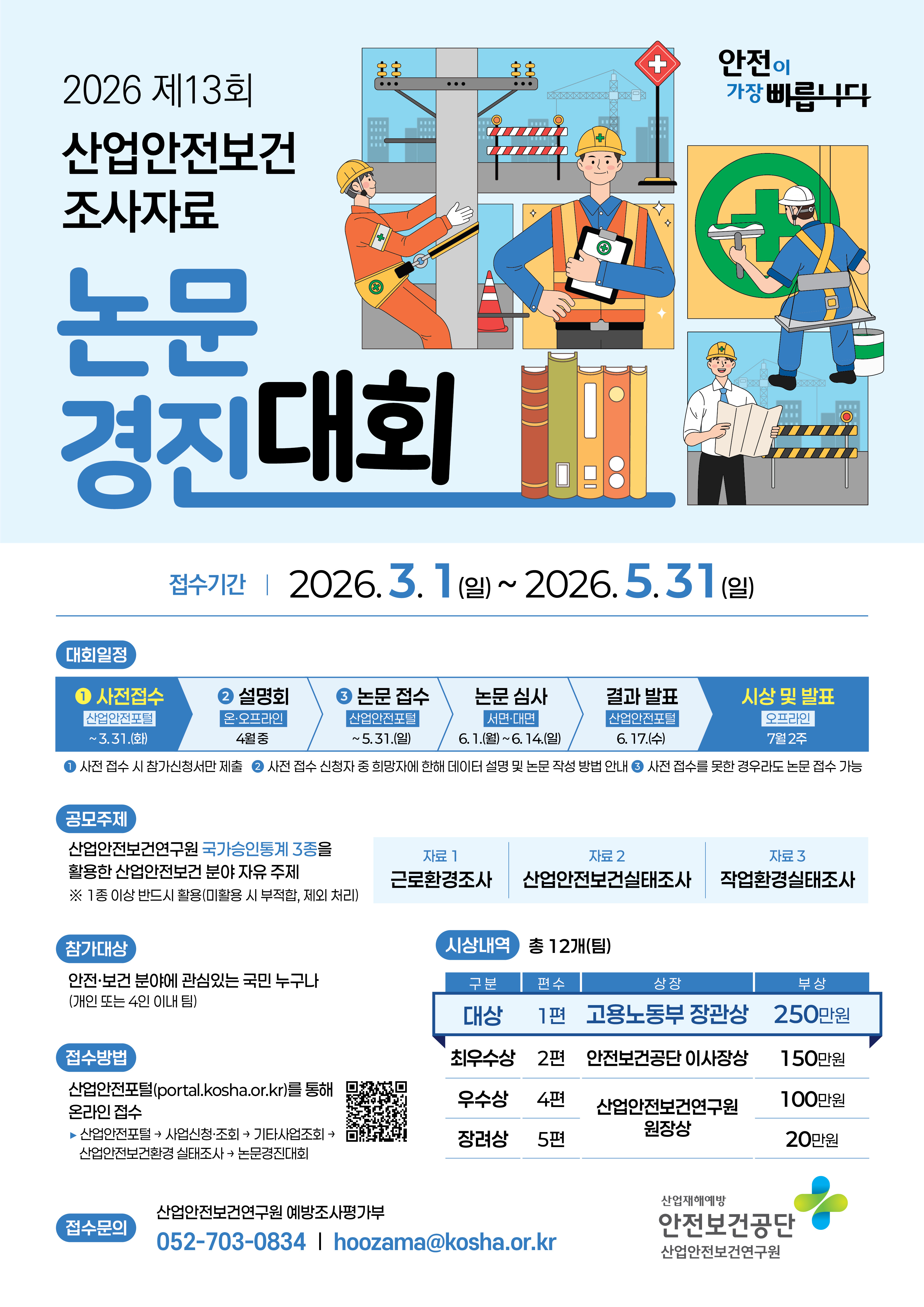 fnctId=bbs,fnctNo=72 페이지 공유 글번호 93635 [산업안전보건연구원] 제13회 산업안전보건 조사자료 논문 경진대회 안내 작성일 2026.03.09 수정일 2026.03.09 작성자 통합행정실 조회수 266 첨부파일 [붙임1]『제13회 산업안전보건 조사자료 논문 경진대회』 포스터.jpg [붙임2]『제13회 산업안전보건 조사자료 논문 경진대회』안내문 및 제출양식.hwp [붙임3]『제12회 산업안전보건 조사자료 논문 경진대회』대상 논문.hwp.pdf