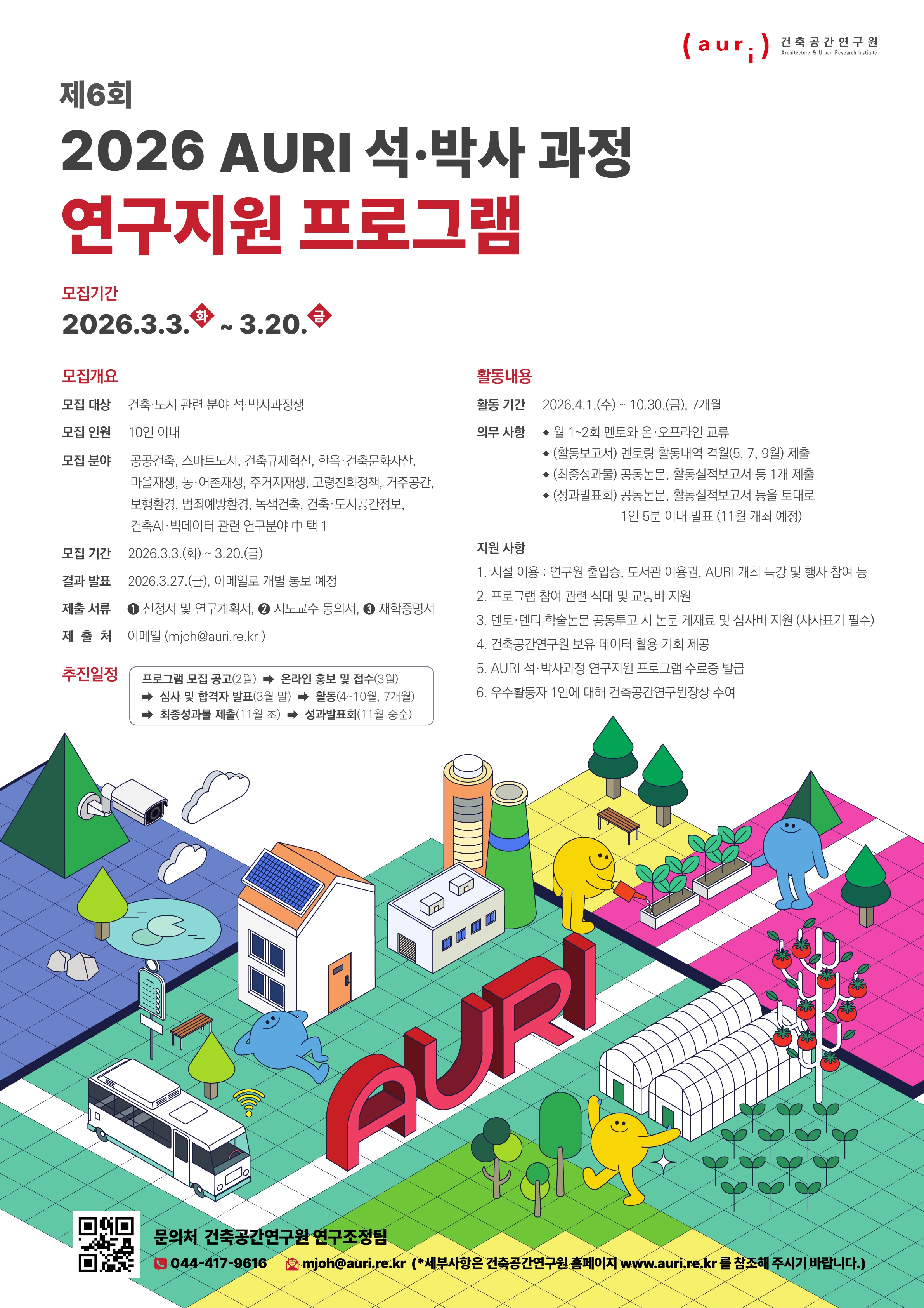 fnctId=bbs,fnctNo=72 페이지 공유 글번호 93636 [건축공간연구원] 2025 AURI 석·박사과정 연구지원 프로그램 안내 작성일 2026.03.09 수정일 2026.03.09 작성자 통합행정실 조회수 252 첨부파일 붙임1. 2026 AURI 석박사과정 연구지원 프로그램 모집공고.hwp 붙임2. 2026 AURI 석박사과정 연구지원 프로그램 포스터.pdf